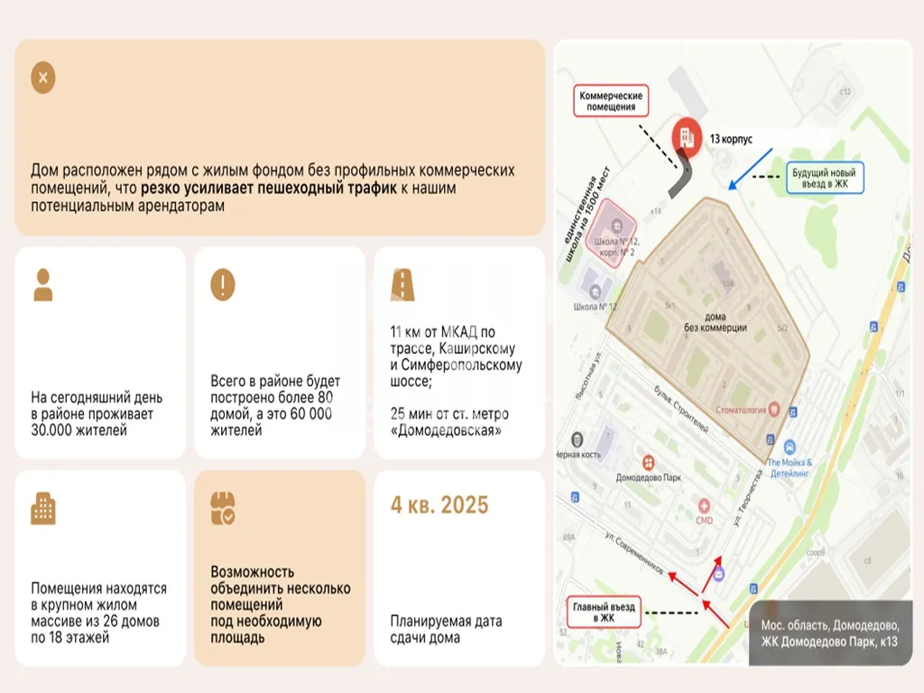 Помещение располагается на 1-м этаже первой линии жилого комплекса. В шаговой доступности от помещения, остановка общественного транспорта. Помещение находится в окружении сетевых арендаторов. Интенсивный автомобильный и пешеходный трафик вдоль помещения. Есть место для размещения рекламы. Парковка перед фасадом. 4 кв. 2025 год