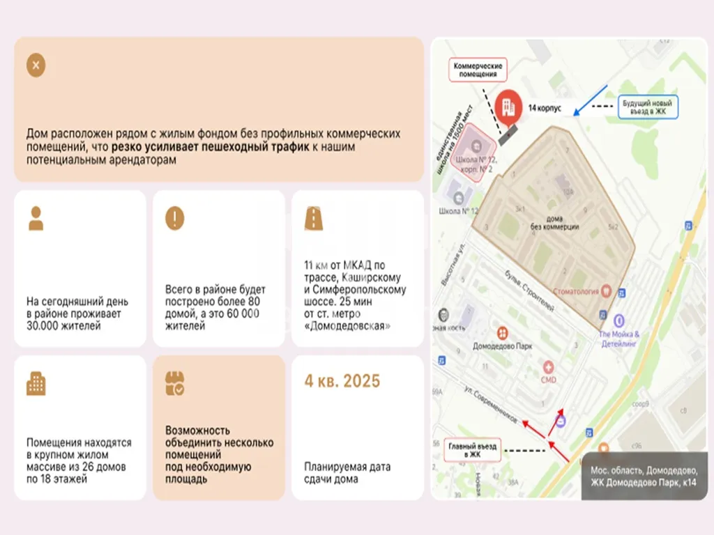 Помещение располагается на 1-м этаже первой линии жилого комплекса. В шаговой доступности от помещения, остановка общественного транспорта. Помещение находится в окружении сетевых арендаторов. Интенсивный автомобильный и пешеходный трафик вдоль помещения. Есть место для размещения рекламы. Парковка перед фасадом. Ввод в эксплуатацию 4 кв. 2025 года.
