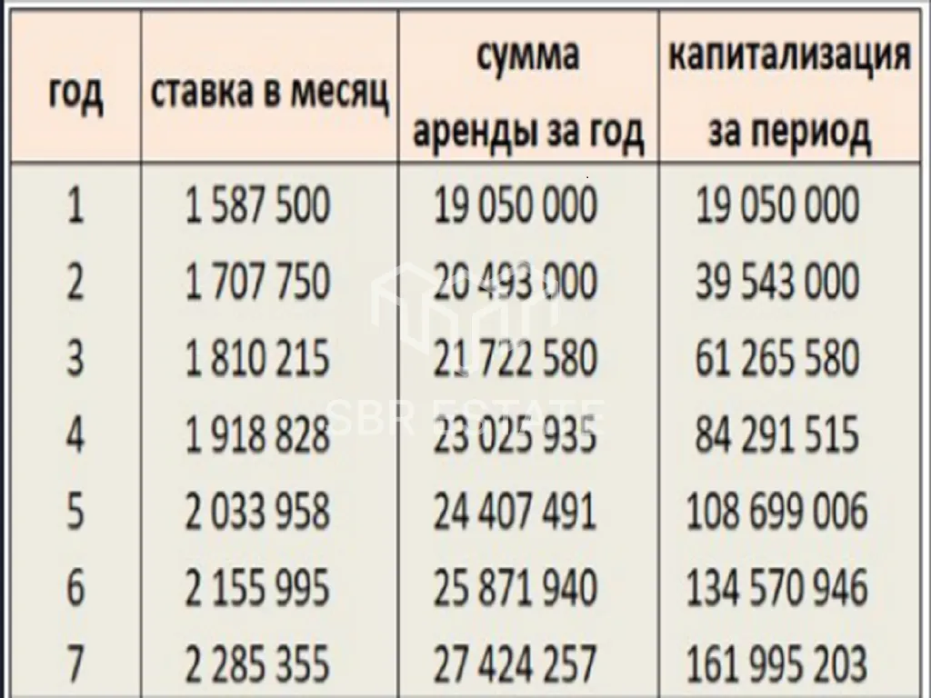 Арендатор: «Клуб», месячная арендная плата 1 587 500 рублей. Договор аренды подписан с 2025 года по 2032 год. Ежегодная индексация стоимости аренды привязана к официальной ставке инфляции.