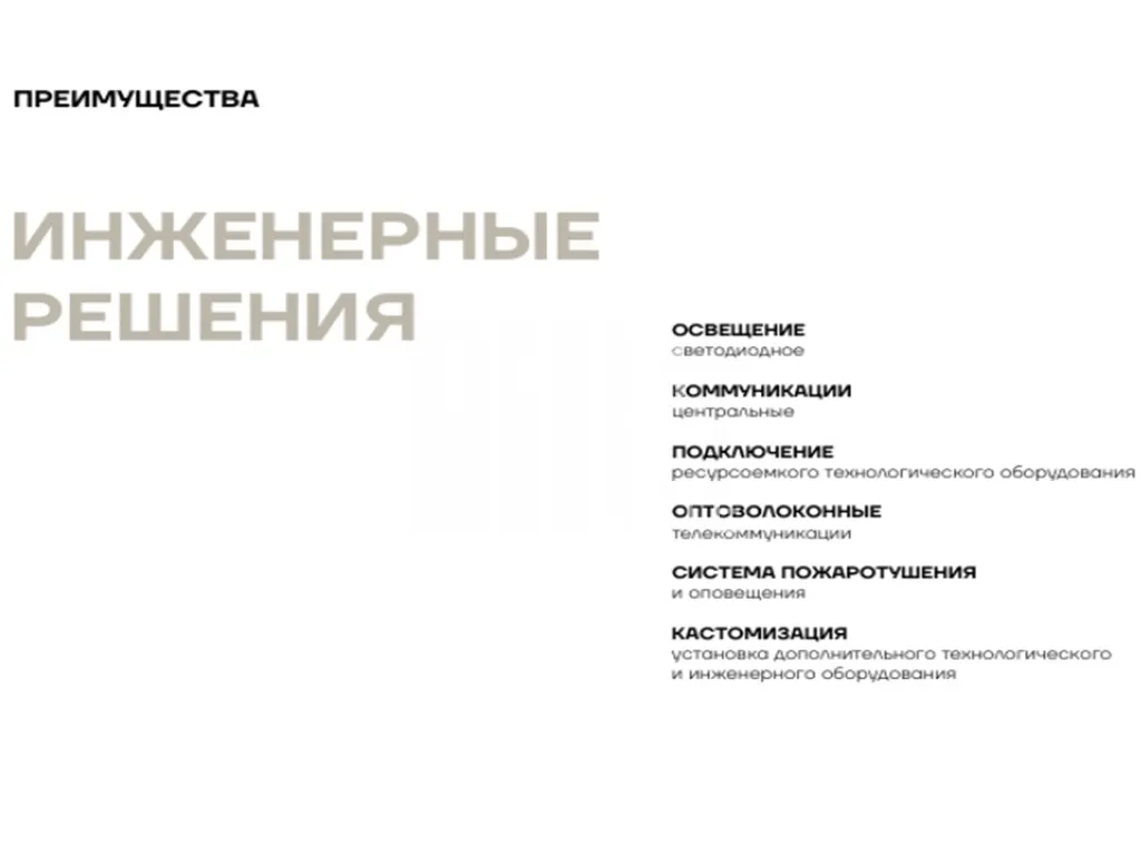 Тип пола: бетон с анти-пылевым покрытием. Светодиодное освещение. Современные системы пожарной сигнализации и пожаротушения.