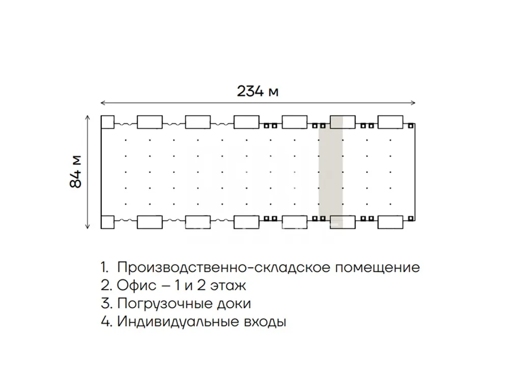 Помещение площадью 1590 м2 из них производственно-складская площадь 1240 м2, офисно-торговая площадь 294, мезонин 56 м., располагается на 1-м этаже, высота потолка 8 м. Открытая планировка, нагрузка на пол - 5 т/м2. Электрическая мощность - 318 кВт. Разгрузка с пандуса. Парковка перед фасадом. Помещение отапливаемое. Количество доков 2. Шаг колон 12*18.