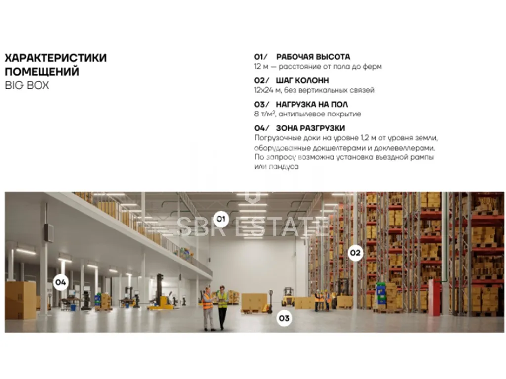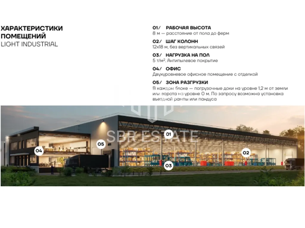 Помещение площадью 5429 м2 из них производственно-складская площадь 4202 м2, офисно-торговая площадь 316, мезонин 911 м., располагается на 1-м этаже, высота потолка 12.5 м. Открытая планировка, нагрузка на пол - 12.5 т/м2. Электрическая мощность - 1085 кВт. Разгрузка с пандуса. Парковка перед фасадом. Помещение отапливаемое. Количество доков 2. Шаг колон 12*24.