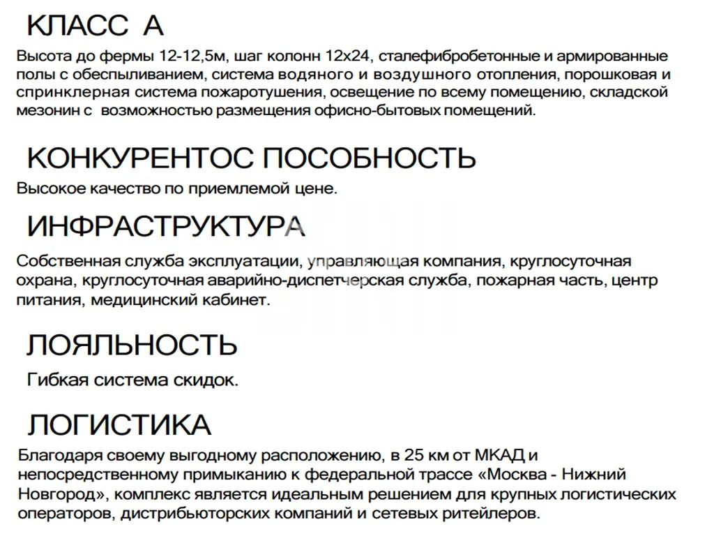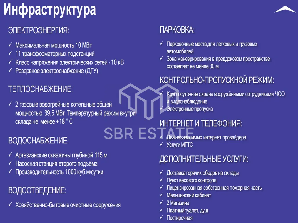Армированные полы, нагрузка – 5 т на м². Порошковая система пожаротушения. Отопление: регистровое. Освещение: светодиодное.