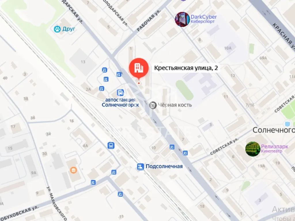 Помещение располагается на 1-м этаже отдельно стоящего здания. В шаговой доступности от помещения, остановка общественного транспорта, автостанция Солнечногорск, платформа Подсолнечная. Помещение находится в окружении сетевых арендаторов. Интенсивный автомобильный и пешеходный трафик вдоль помещения. Есть место для размещения рекламы. Парковка перед фасадом.