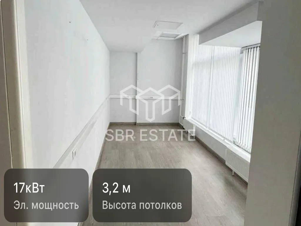 Офисное помещение располагается на 1-м этаже, открытая планировка, высота потолков 3,2 м. Электрическая мощность 17 кВт.