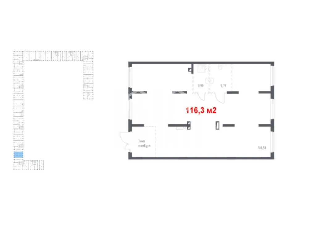 Помещение 116,3 м2 располагается на 1 этаже, открытая планировка, отдельный вход с фасада, высота потолка 3,5 м, витринные окна по фасаду. Электрическая мощность 23 кВт. Парковка перед фасадом. Место для размещения рекламы на фасаде. Ввод в эксплуатацию: 4 кв. 2025 года.
