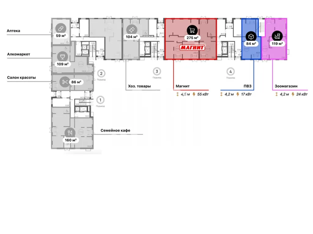 Арендатор: «Магнит»(275м2), месячная арендная плата 1 год 540 000 рублей, со 2-го года 685 000 рублей, 6% от РТО. Договор аренды подписан с 2025 года по 2035 год.
