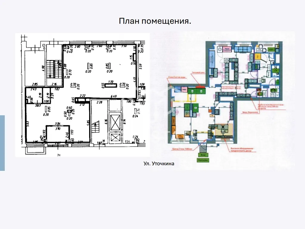 В помещении открытая планировка, отдельный вход с фасада, высота потолка 4 м, витринные окна по фасаду. Электрическая мощность 45 кВт.
