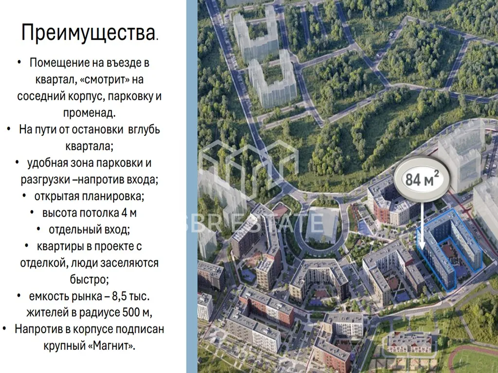 Помещение располагается на 1-м этаже первой линии жилого комплекса. В шаговой доступности от помещения, остановка общественного транспорта. Помещение находится в окружении сетевых арендаторов. Интенсивный автомобильный и пешеходный трафик вдоль помещения. Есть место для размещения рекламы. Парковка перед фасадом. Ввод в эксплуатацию 31 июля 2026 год.