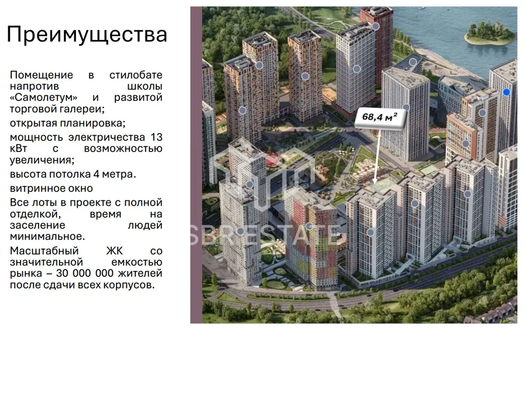 Помещение располагается на 1-м этаже первой линии жилого комплекса. В шаговой доступности от помещения, остановка общественного транспорта. Помещение находится в окружении сетевых арендаторов. Интенсивный автомобильный и пешеходный трафик вдоль помещения. Есть место для размещения рекламы. Парковка перед фасадом. Дом введен в эксплуатацию. Ключи 4 кв. 2025 года.