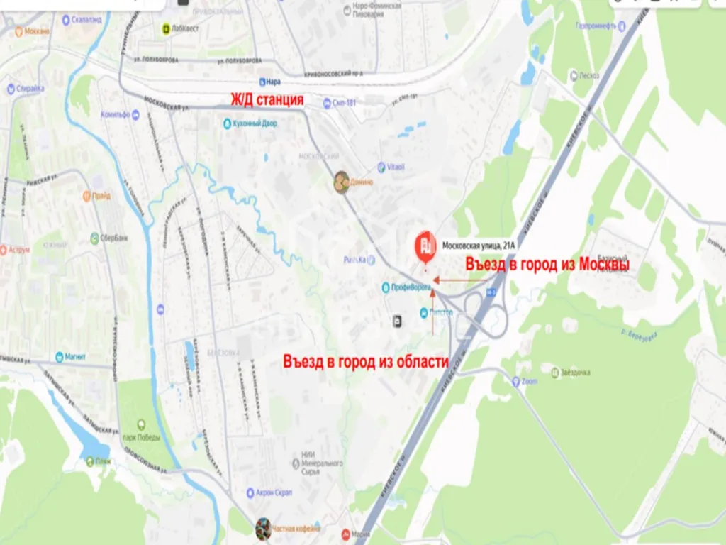 Объект расположен по адресу: Московская область, Наро Фоминский городской округ, город Наро-Фоминск, ул. Московская, д.21 А Имеет привлекательную локацию, въезд в город из Москвы въезд в город из области Ж/Д станция "Нара" в 10 мин пешком.