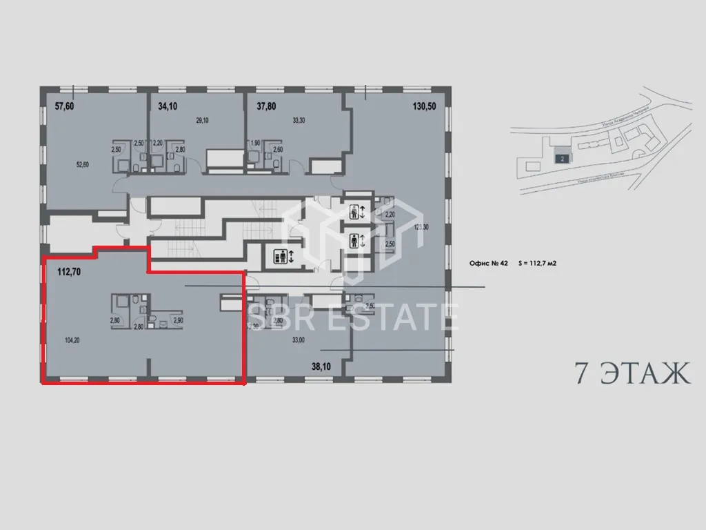 Офисное помещение располагается на 7-м этаже, открытая планировка, высота потолков 3,3 м. Электрическая мощность 20 кВт. Ввод в эксплуатацию в 4 кв. 2025 года.