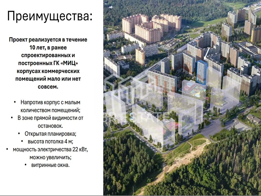 Помещение располагается на 1-м этаже первой линии жилого комплекса. Рядом с помещением остановка общественного транспорта. В помещении открытая планировка, отдельный вход с фасада, высота потолка 4 м, витринные окна по фасаду. Электрическая мощность 22 кВт. Парковка перед фасадом.