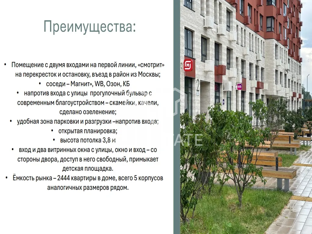 Помещение располагается на 1-м этаже первой линии жилого комплекса. Рядом с помещением остановка общественного транспорта. В помещении открытая планировка, отдельный вход с фасада, высота потолка 3,8 м, витринные окна по фасаду. Электрическая мощность 21 кВт. Парковка перед фасадом.