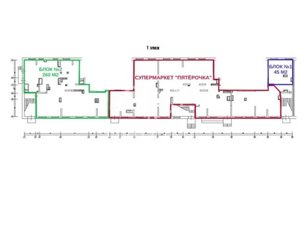 Помещение располагается в окружении сетевых арендаторов. Интенсивный автомобильный и пешеходный трафик вдоль помещения. Есть место для рекламы. Помещение с ремонтом в 70 м находится вход в супермаркет "Пятёрочка" (Блок №2 на плане с крупными блоками):
