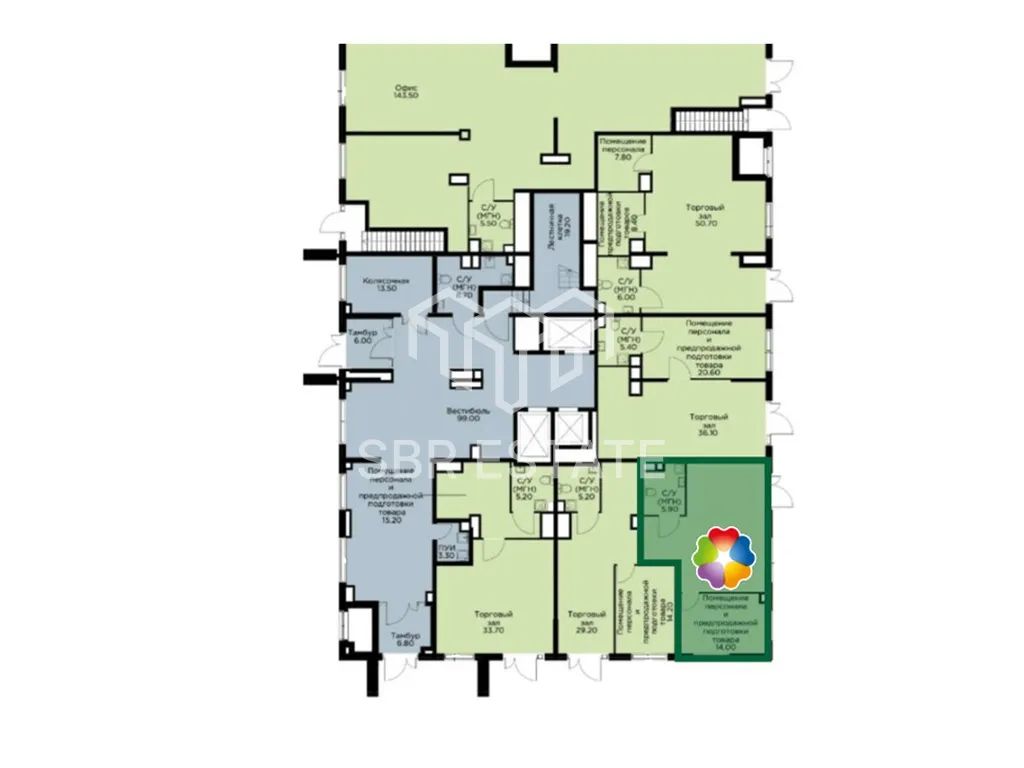 В помещении смешанная планировка, отдельный вход с фасада, высота потолка 3,5 м, витринные окна по фасаду. Электрическая мощность 15 кВт.