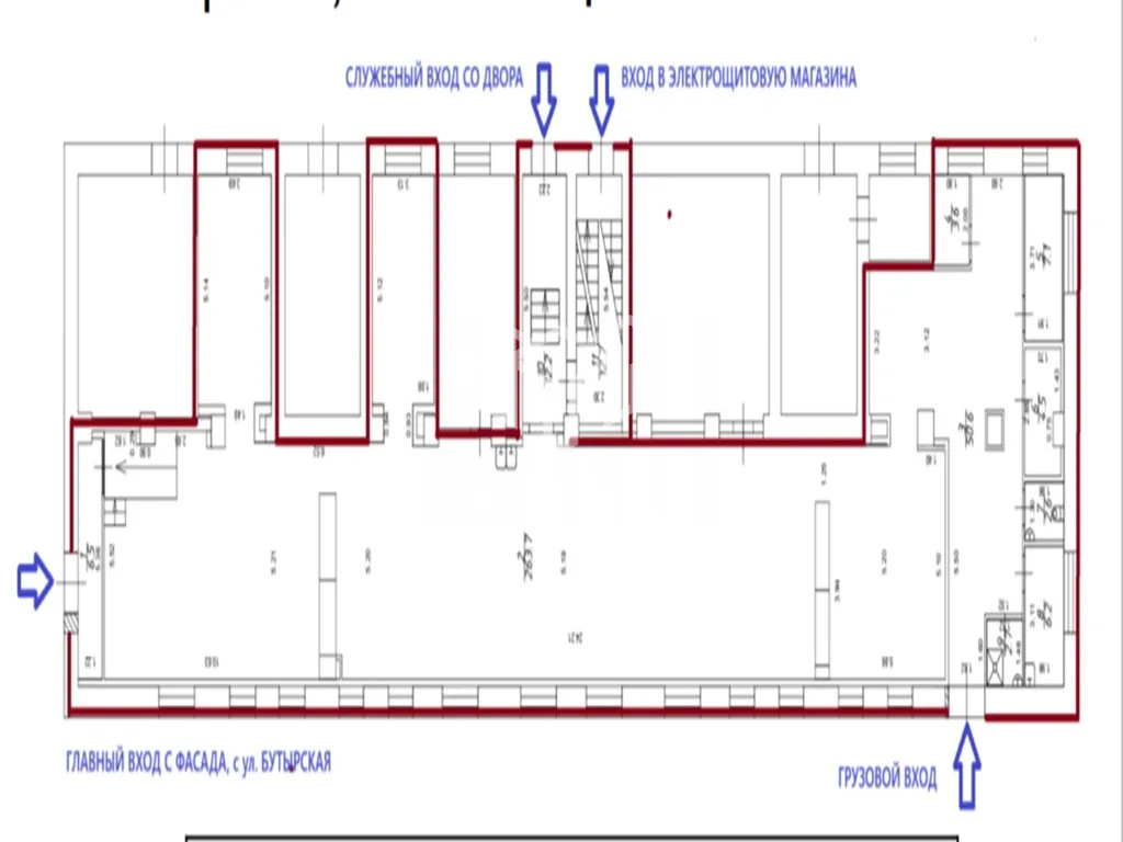 В помещении открытая планировка, 3 отдельных входа: 1 с улицы для покупателей, 1 с улицы в разгрузочную зону, 1 для персонала, со двора, высота потолка 3 м, витринные окна по фасаду. Электрическая мощность 65 кВт.