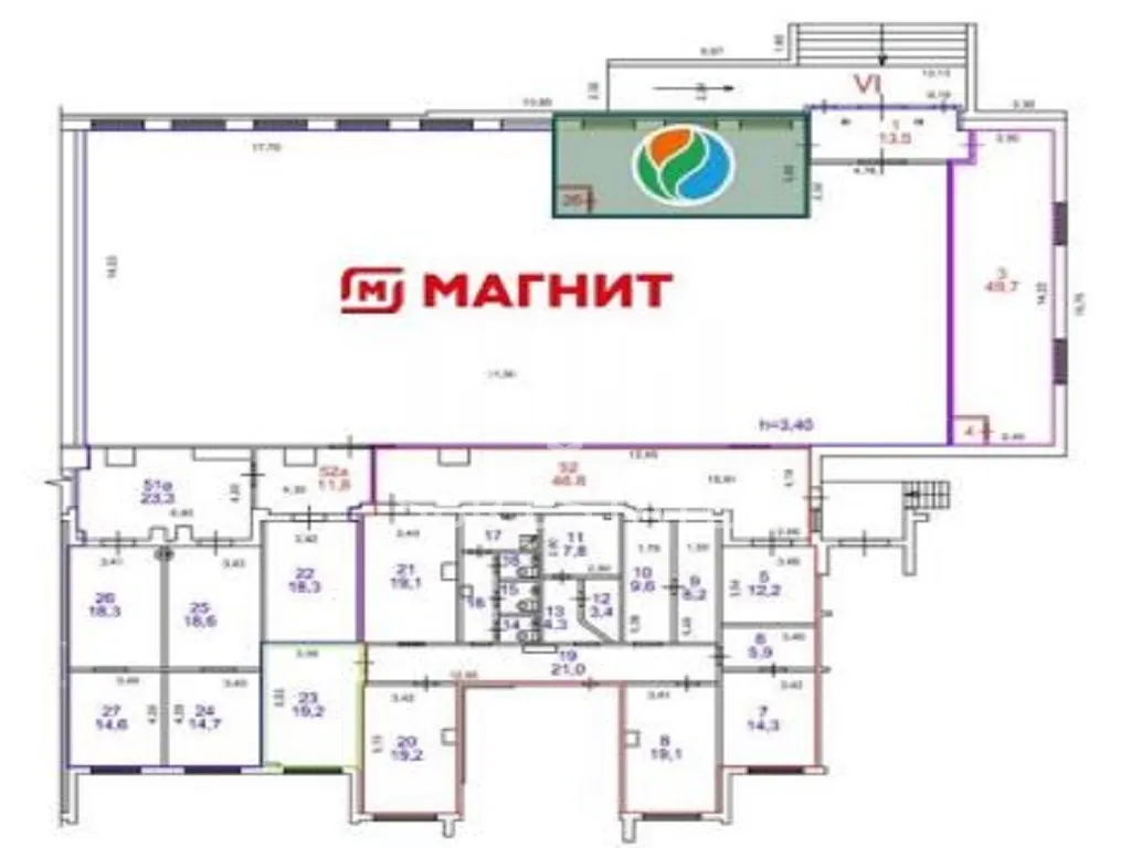 В помещении открытая планировка, отдельный вход с фасада, высота потолка 3,4 м, витринные окна по фасаду. Электрическая мощность 15 кВт.