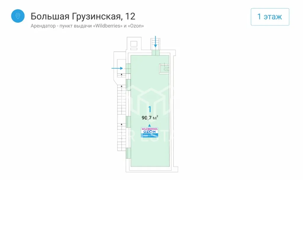 Продажа готового арендного бизнеса с арендатором «Вайлдберриз», «Озон» площадью 90,7 м2 расположенного по адресу: Москва, Большая Грузинская улица, 12 (5 минут пешком, 2 минуты на транспорте от метро Баррикадная).