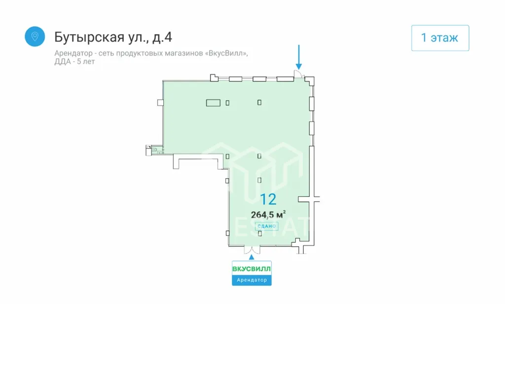 Арендатор: «Вкусвилл», месячная арендная плата 1 050 000 рублей. Договор аренды подписан на 5 лет.