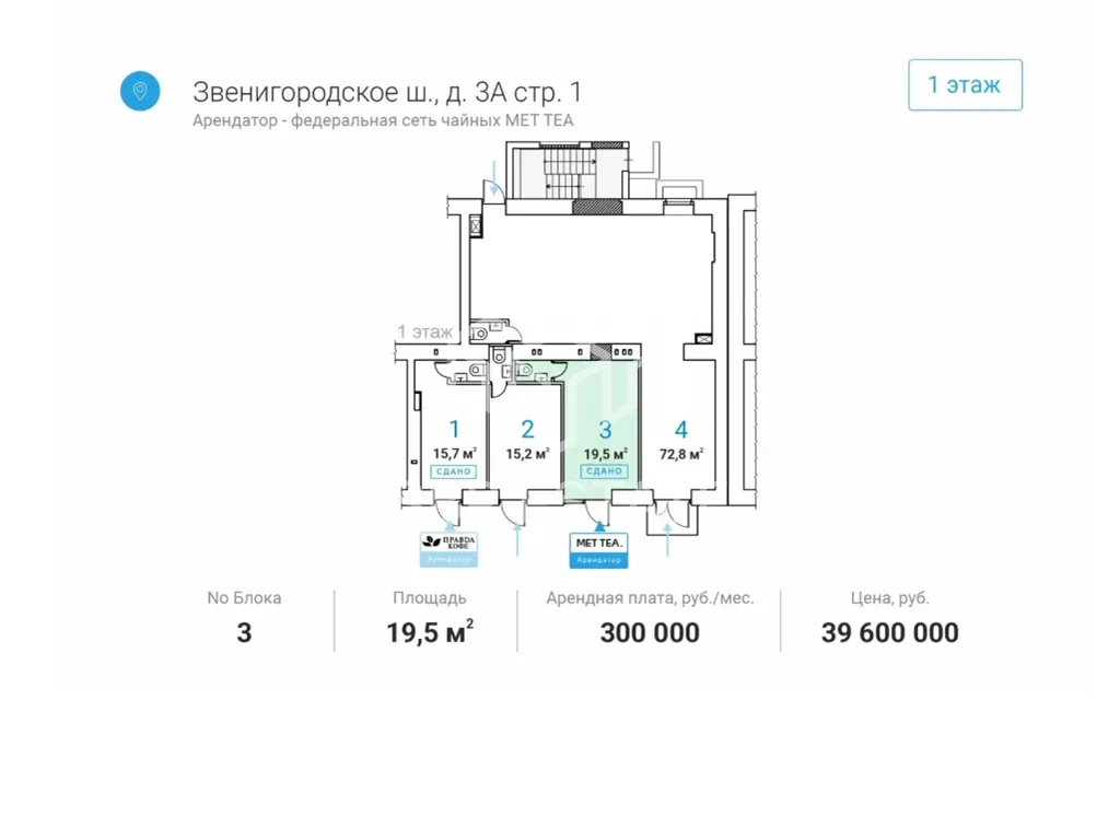 Арендатор: «MET TEA», месячная арендная плата 300 000 рублей.
