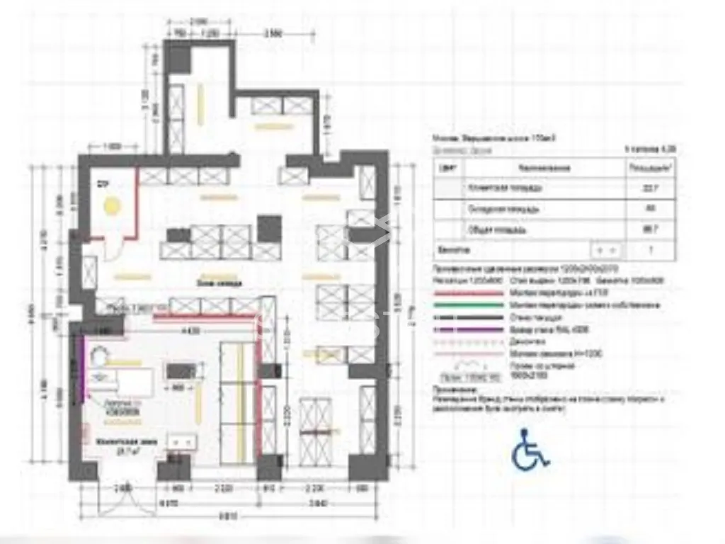 В помещении открытая планировка, отдельный вход с фасада, высота потолка 4.5 м, витринные окна по фасаду. Электрическая мощность 17 кВт.