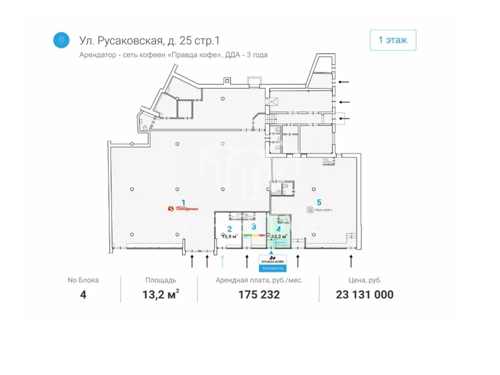 Арендатор: кофейня «Правда кофе», месячная арендная плата 175 232 рублей. Договор аренды подписан на 3 года.