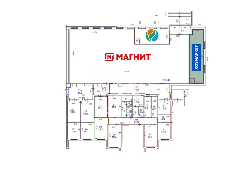 В помещении открытая планировка, отдельный вход с фасада, высота потолка 3,4 м, витринные окна по фасаду. Электрическая мощность 30 кВт.