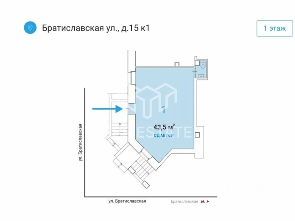 Продажа торгового помещения площадью 43,5 м2 расположенного по адресу: Москва, Братиславская улица, 15к1 (6 минут пешком от метро Братиславская).