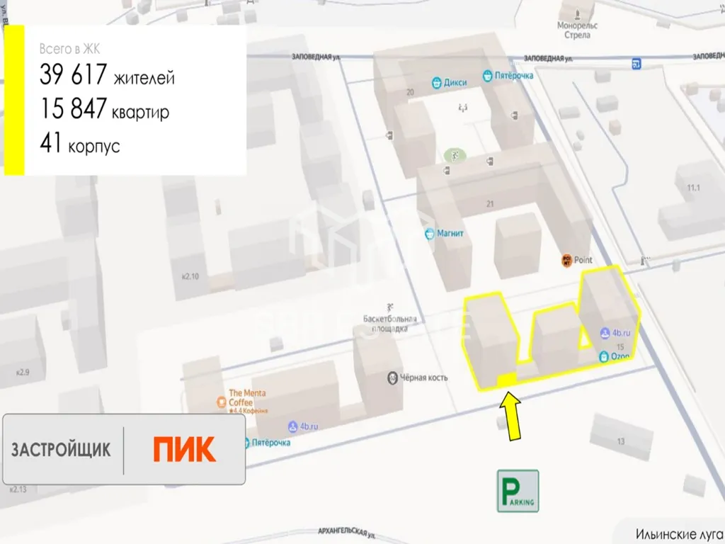Помещение располагается на 1-м этаже первой линии жилого комплекса. В шаговой доступности от помещения, остановка общественного транспорта. Помещение находится в окружении сетевых арендаторов. Интенсивный автомобильный и пешеходный трафик вдоль помещения. Есть место для размещения рекламы. Парковка перед фасадом.