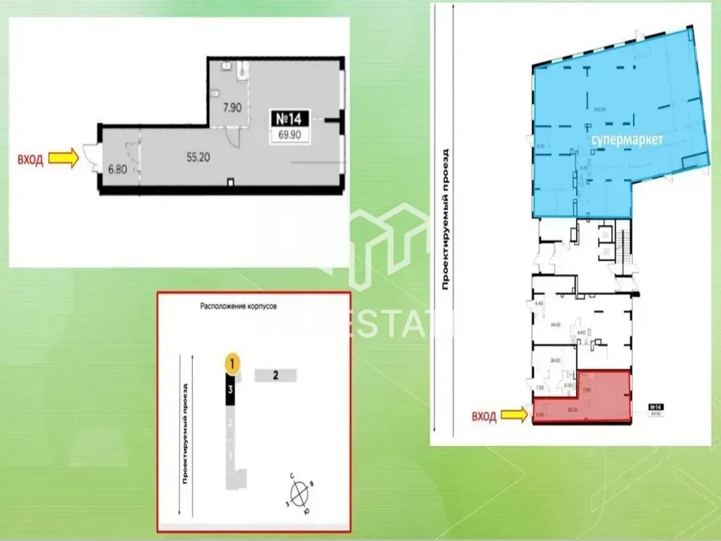 Помещение площадь 69,9 м2, располагается на 1 этаже, открытая планировка, отдельный вход с фасада, высота потолка 3 м, витринные окна по фасаду. Электрическая мощность 14кВт. Парковка перед фасадом. Место для размещения рекламы. Введ в эксплуатацию май 2025 год.