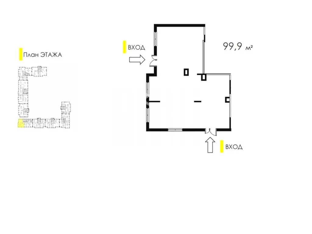 Помещение площадью 99,9 м2, располагается на 1 этаже, открытая планировка, помещение угловое, отдельный вход с фасада, высота потолка 4 м, витринные окна по фасаду. Электрическая мощность 20 кВт. Парковка перед фасадом. Место для размещения рекламы. Ввод в эксплуатацию 4-й квартал 2025 года.