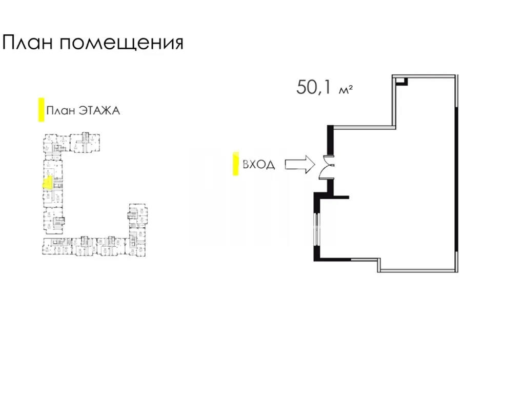Помещение площадью 50,1 м2, располагается на 1 этаже, открытая планировка, отдельный вход с фасада, высота потолка 4 м, витринные окна по фасаду. Электрическая мощность 10 кВт. Парковка перед фасадом. Место для размещения рекламы. Ввод в эксплуатацию 4-й квартал 2025 года.