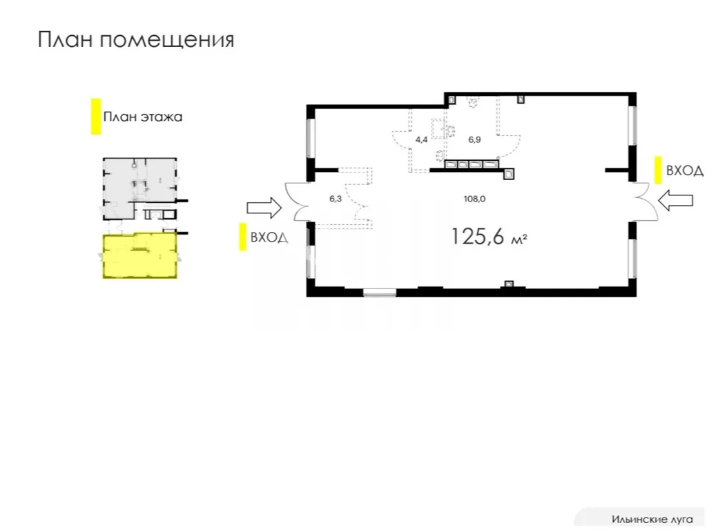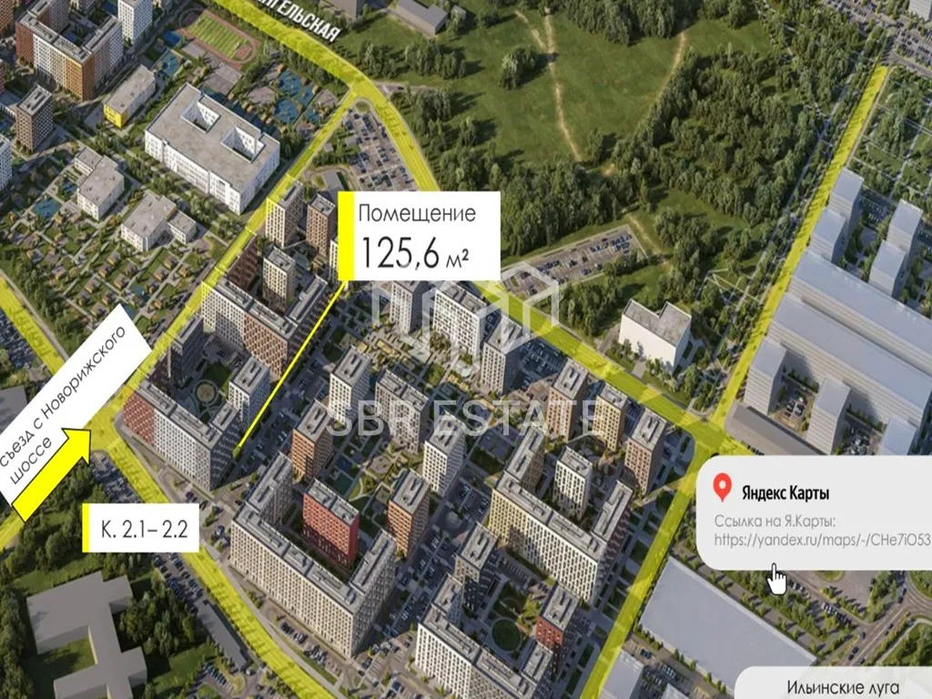 Продажа коммерческого помещения площадью 125,6 м2 по адресу: Московская Область, г.о. Красногорск, пос. Ильинское-Усово, ЖК «Ильинские луга», к. 2.1-2.2 (50 минут транспортом от метро Ильинская). 1-я линия домов.