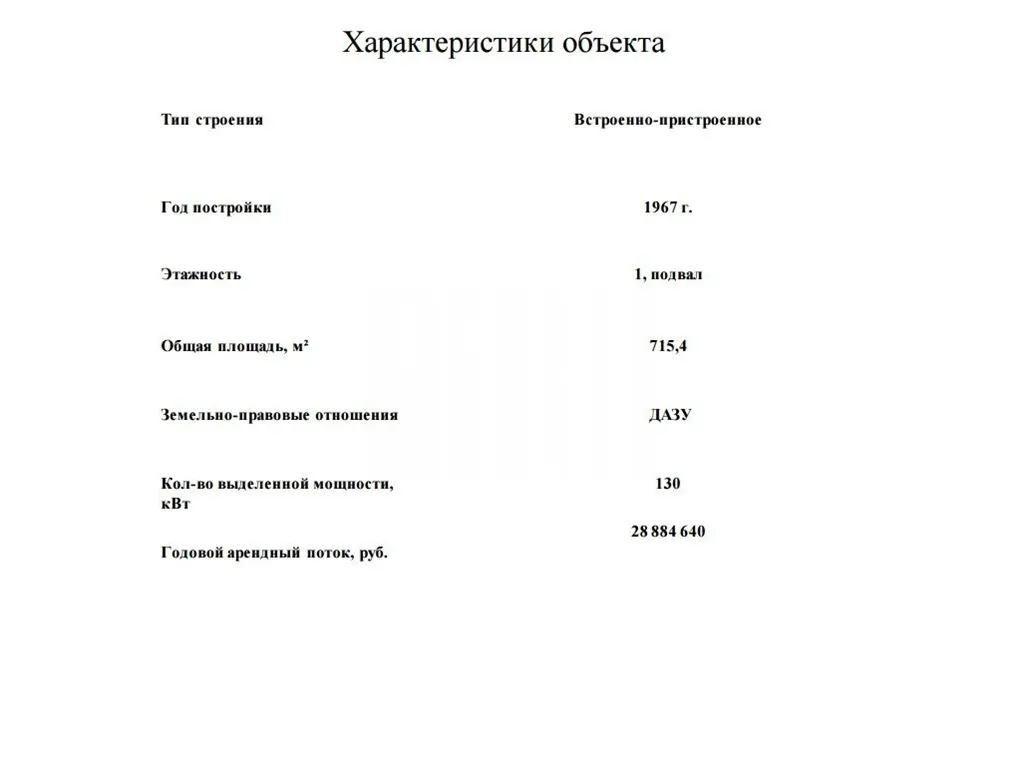 Помещение площадью 715,4 м2 из них на 1 этаже 521,6 м2 и в подвале 193,8 м2, открытая планировка, отдельный вход с фасада, высота потолка 3 м.- 5 м., витринные окна по фасаду. Электрическая мощность 130 кВт. Парковка перед фасадом. Место для размещения рекламы.