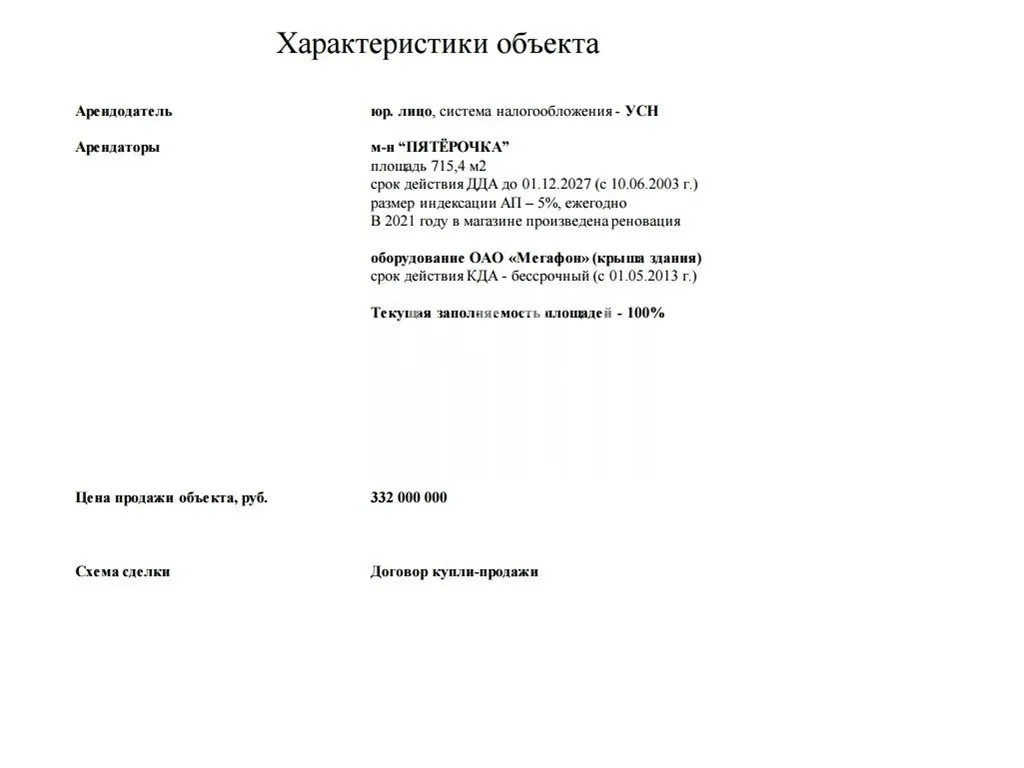 Арендатор: магазин Пятерочка(после реновации), месячная арендная плата 2 407 053 рубля. Договор аренды подписан на 13 лет с 2014 года. Окупаемость 11,5 лет.