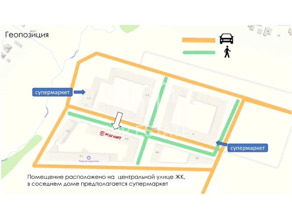 Помещение располагается на первой линии жилого комплекса, в центре жилого массива, рядом остановка общественного транспорта. Интенсивный автомобильный и пешеходный трафик вдоль помещения.