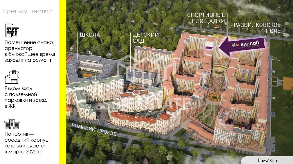 Продажа коммерческого помещения 144,4 м2 с арендаторами магазин ВинЛаб и Tabak(less) по адресу: Московская Область, г.о. Ленинский, пос. Развилка, Римский проезд, к. 7 (30 минут транспортом от метро Домодедовская). 1-я линия домов.